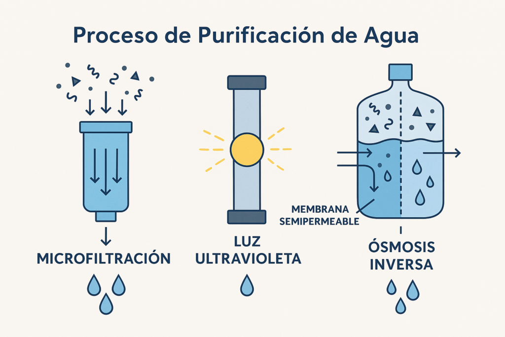 El proceso de purificación del agua no es uno solo. Se pueden aplicar varias tecnologías para garantizar que el agua embotellada en garrafones sea segura. Las más utilizadas incluyen: